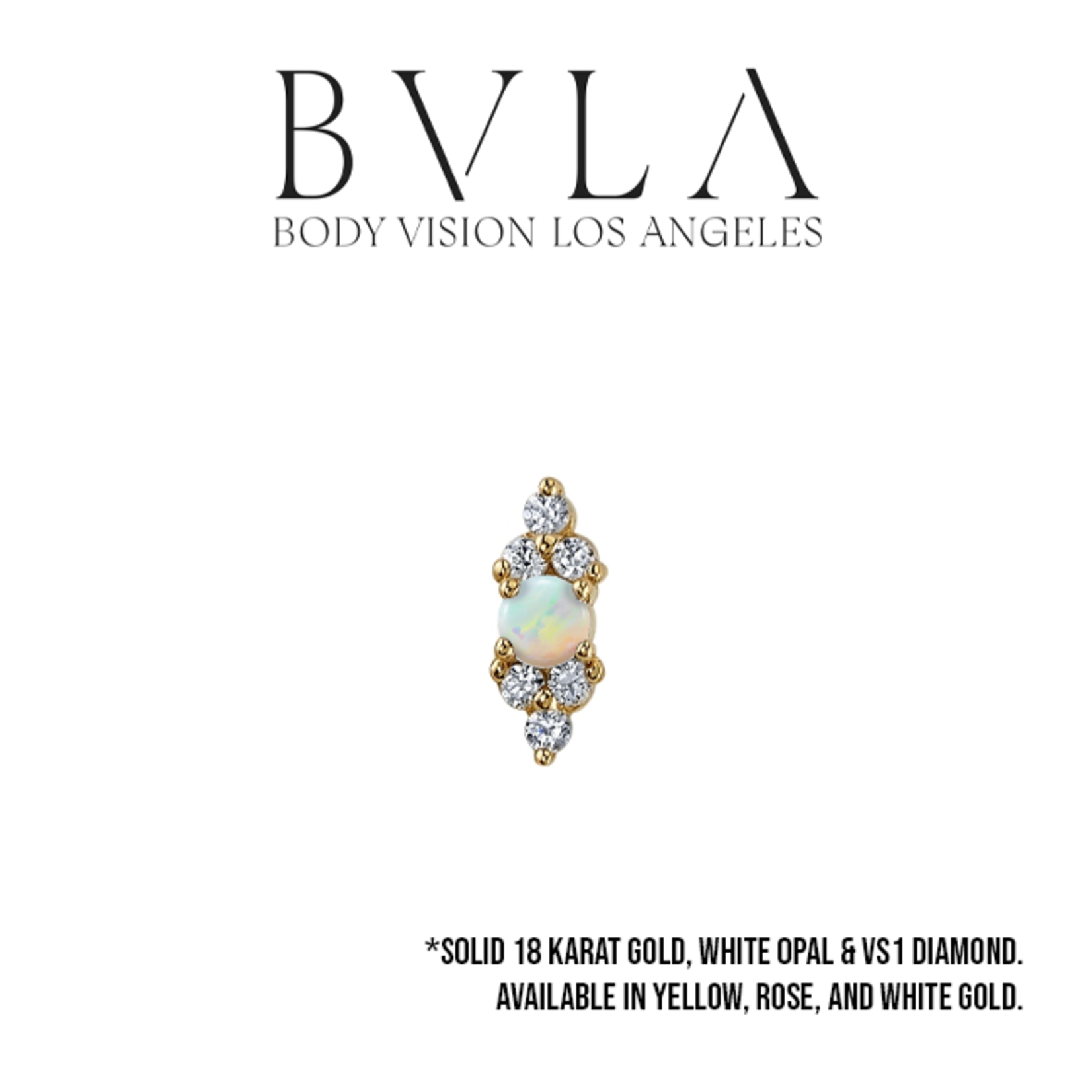 BVLA solid 18 karat gold "Embrace" threaded end with 6x 1.0 VS1 diamond and 2.0 AAA white opal. Available in yellow, rose, and white gold. Fits any of our 18g or 16g internally threaded flatbacks or shafts