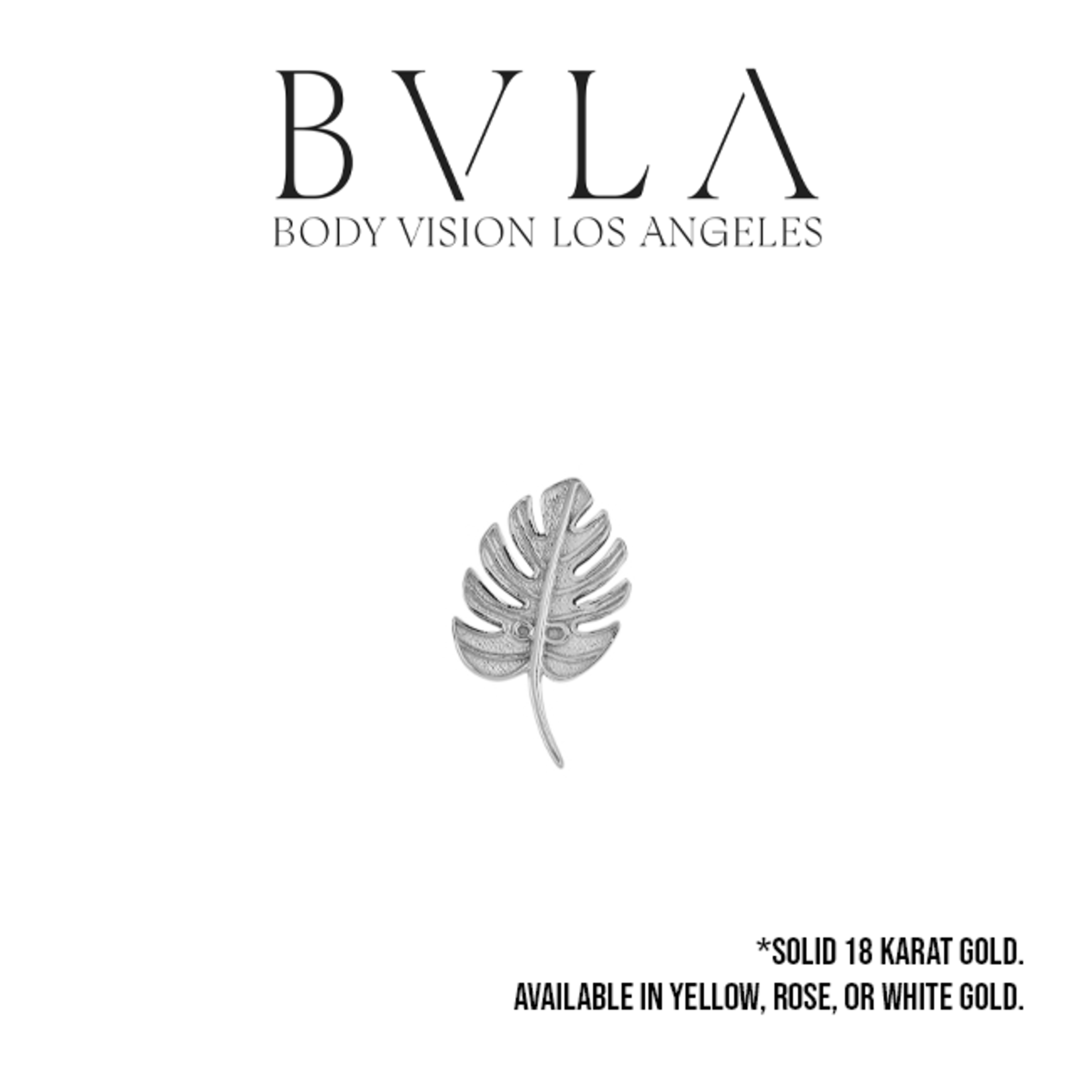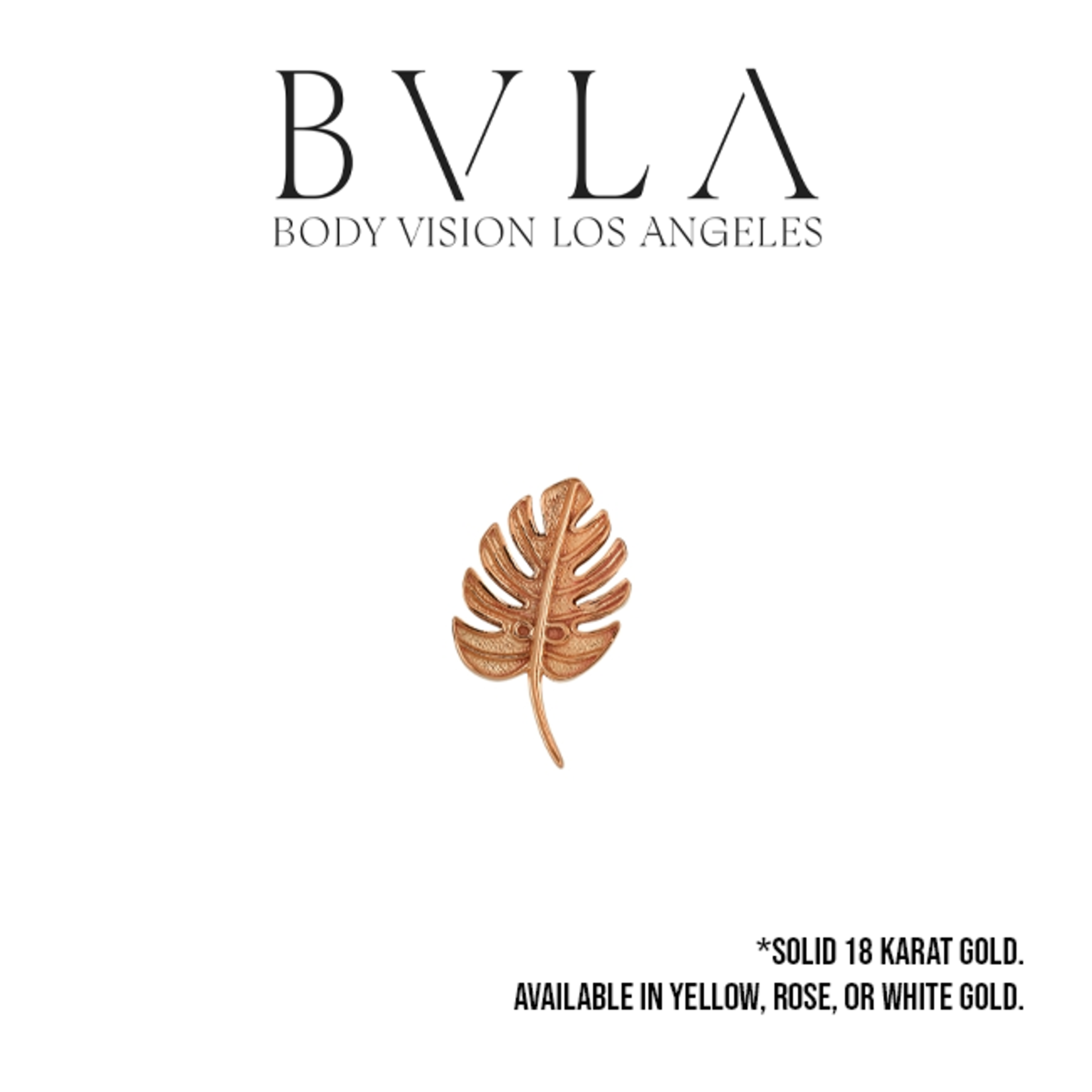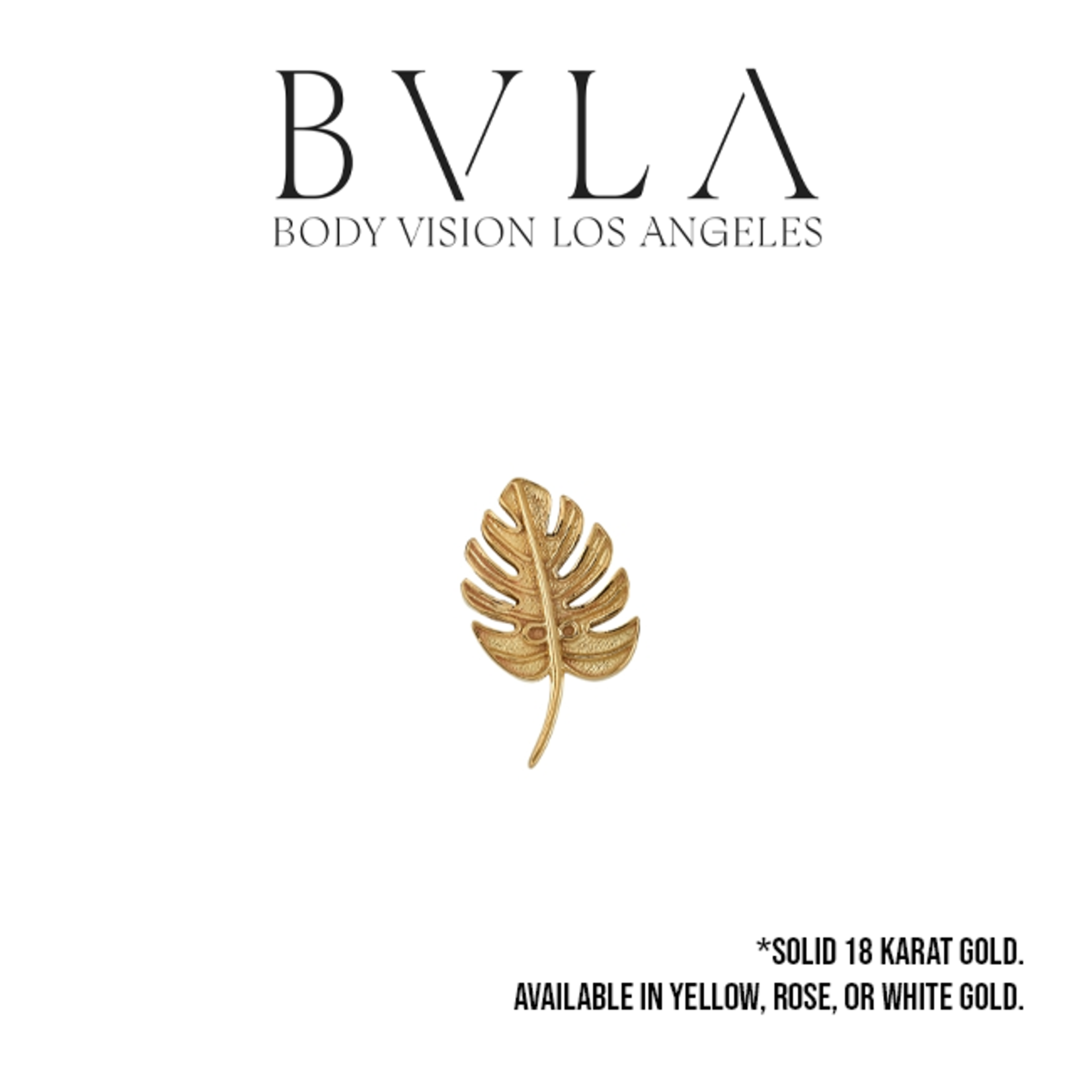 BVLA 10x6 solid 18 karat gold "Monstera Leaf" threaded end. Available in yellow, rose, or white gold and facing either left or right. Fits any of our 18g or 16g internally threaded flatbacks or shafts