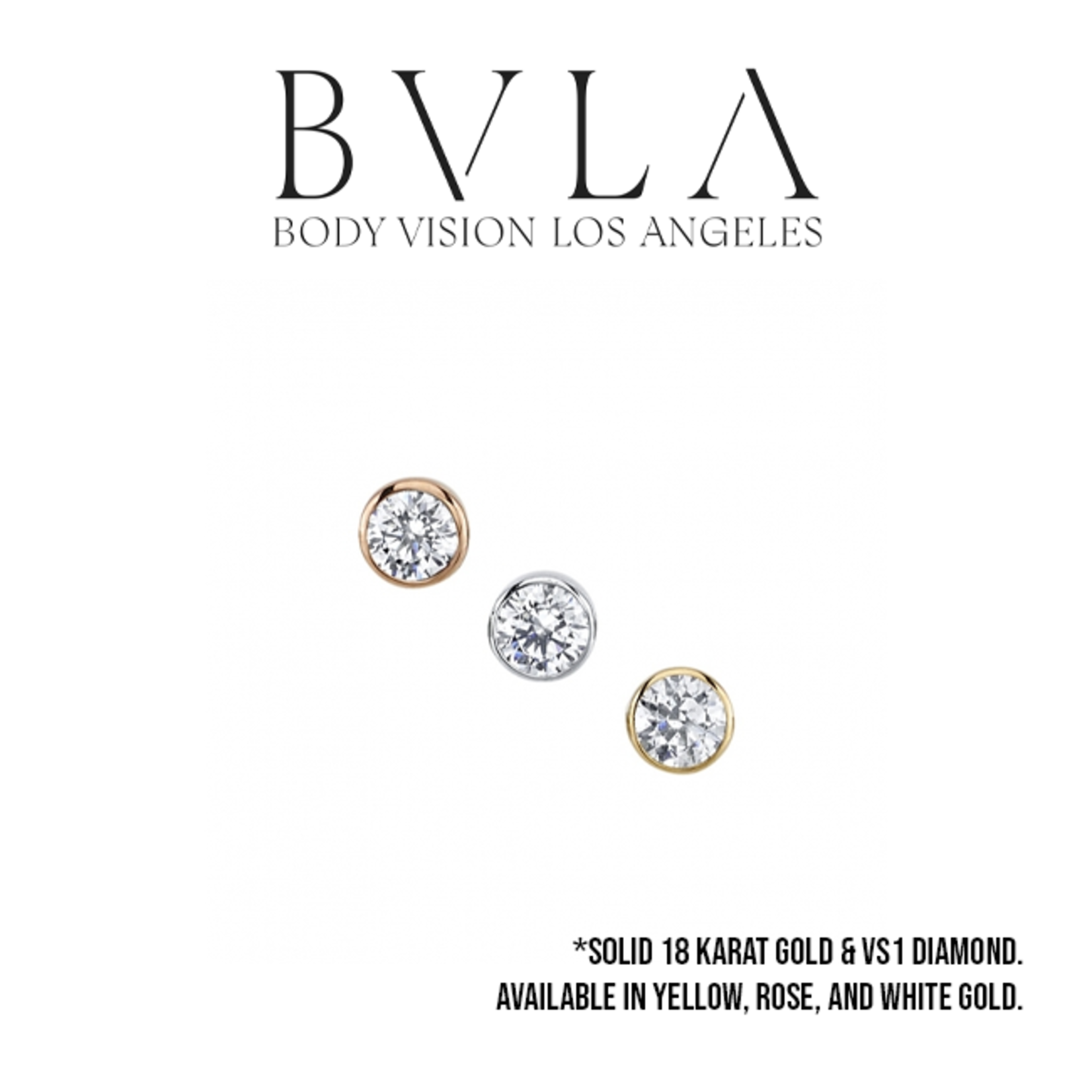 BVLA solid 18 karat gold 2.0 round bezel press fit end with VS1 diamond. Available in yellow, rose, and white gold. Fits any of our press-fit flatbacks or shafts which can be found here and here