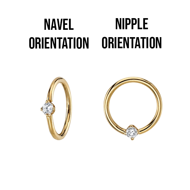 Orientation: When describing the orientation of a gemstone set in a ring we use the phrases “Nipple Orientation” and “Navel Orientation”. This simply refers to the position of the gemstone on the ring and does not mean that these rings will only work in those piercings. For example a ring with a nipple orientation would work perfectly in a daith or septum piercing, and a ring with a navel orientation would work perfectly in a lip or a rook piercing.
