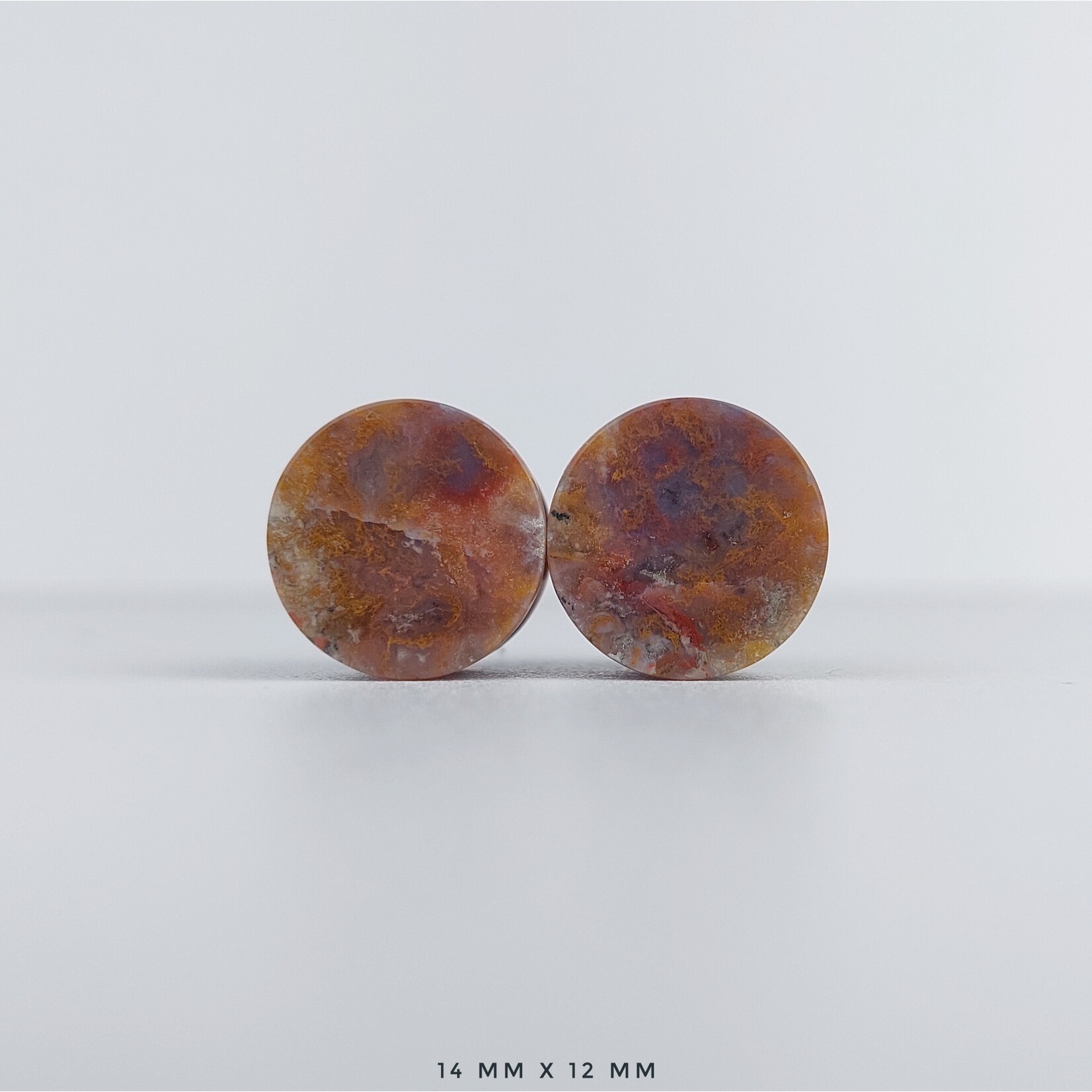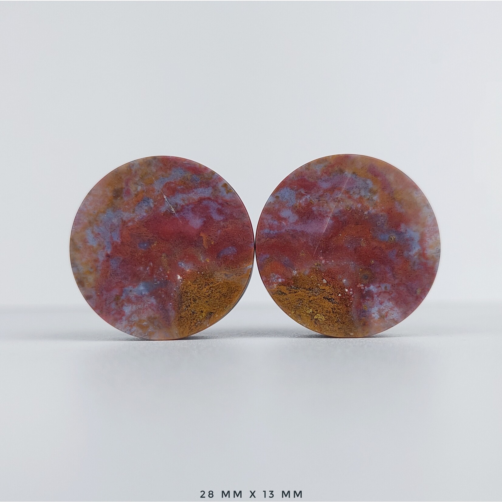 Grit Lapidary premium double flared Red Moss Agate plugs. Each set of plugs is hand carved and specially selected from the finest raw materials to provide the most beautiful book-matched plugs in the industry.